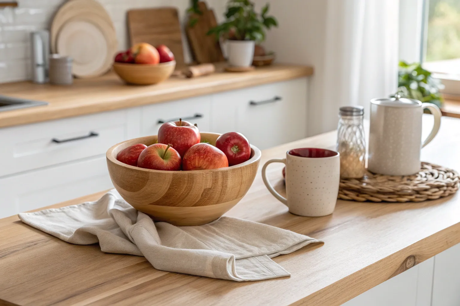 Place a basket filled with fresh or faux apples on your countertop for an organic touch. It’s a simple way to keep healthy snacks within reach while enhancing the decor. 🍎 #AppleDecor #KitchenStyle