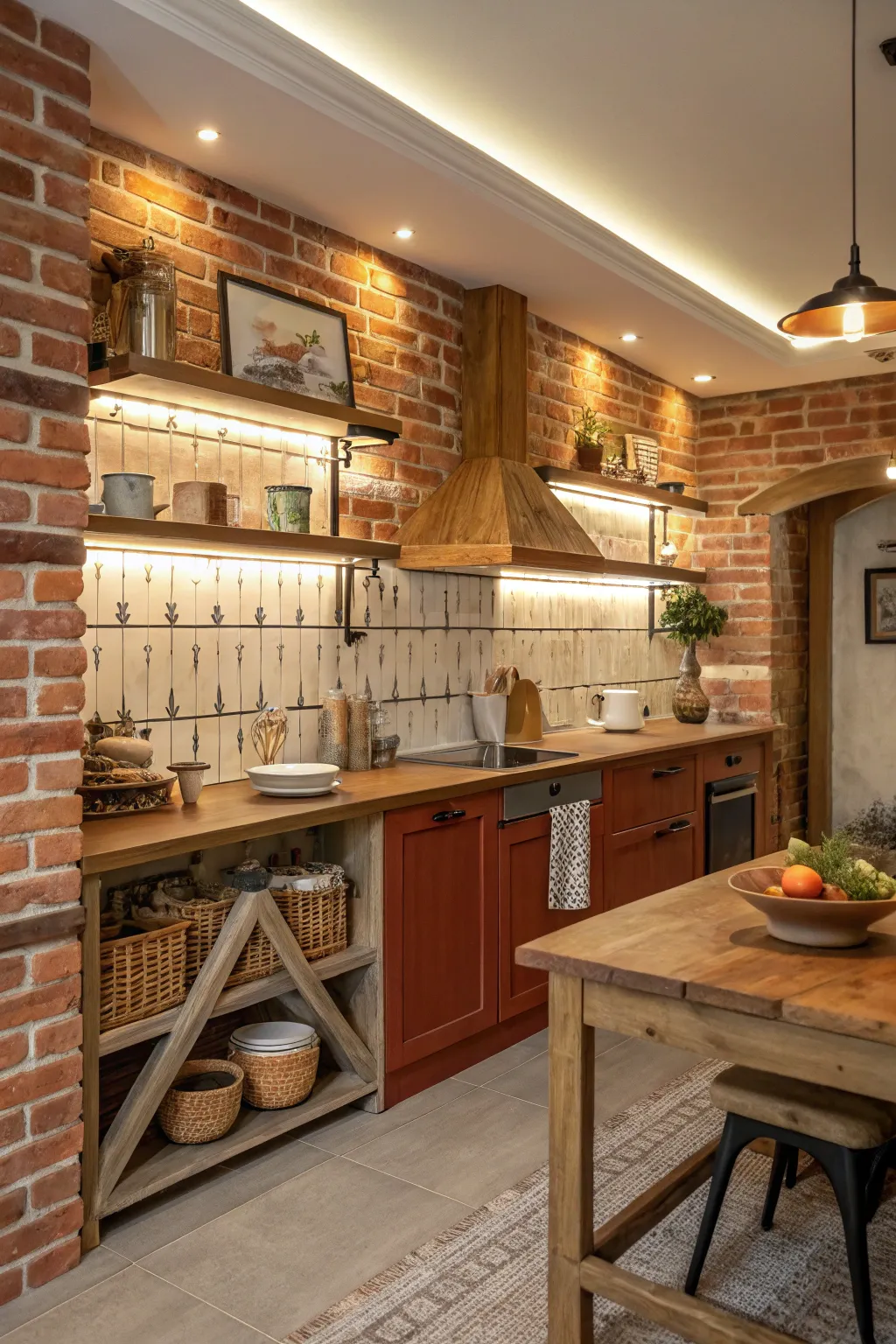 - Under Cabinet LED Lighting: Illuminate your brick wall with warm under cabinet LED lighting. Enhance your kitchen’s ambiance!