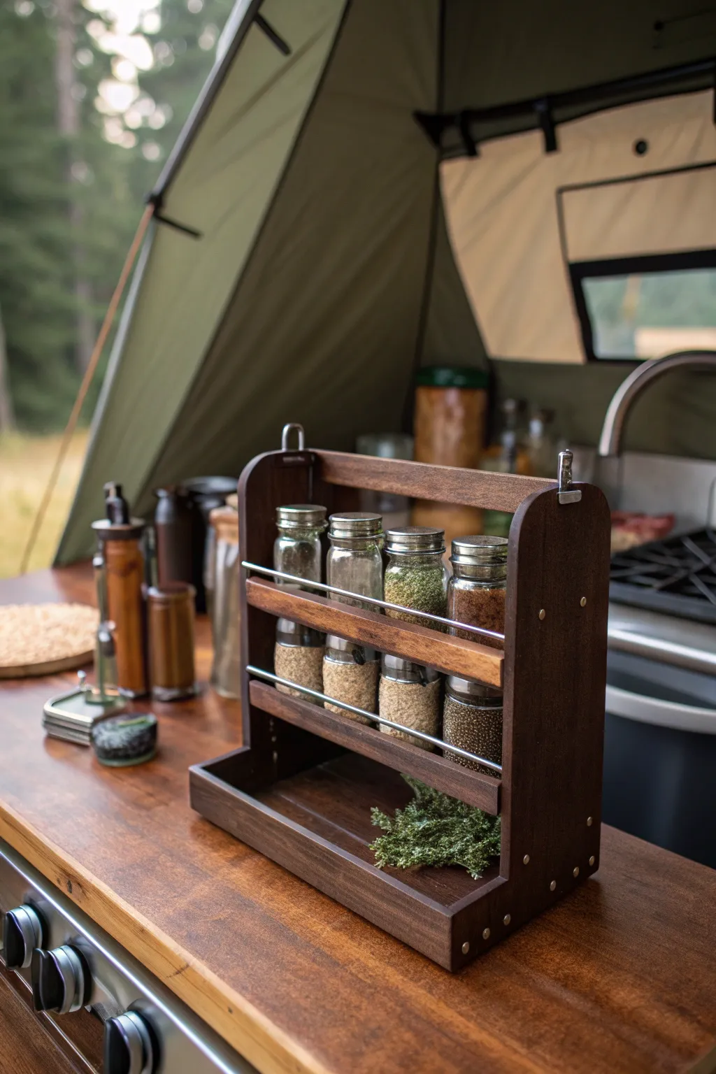 - Portable Wooden Spice Rack: Enhance your camp kitchen setup with this sturdy, stylish wooden spice rack solution.