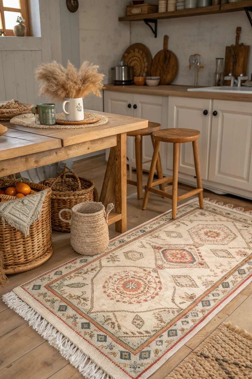 Add a cozy rug to your kitchen floor to enhance comfort and warmth. It’s amazing how a simple rug can transform the feel of a room. 🌟 #CozyHome #InteriorDesign #RugLove