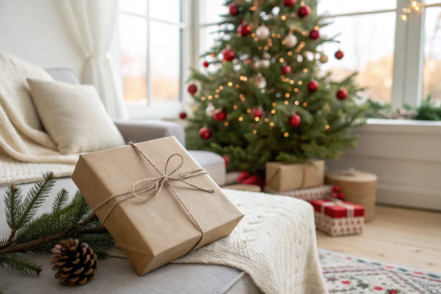Go for a rustic theme with burlap wrapping and wooden accents. 🌲 It’s a charming way to bring a bit of the outdoors in. #RusticCharm #HolidayDecor