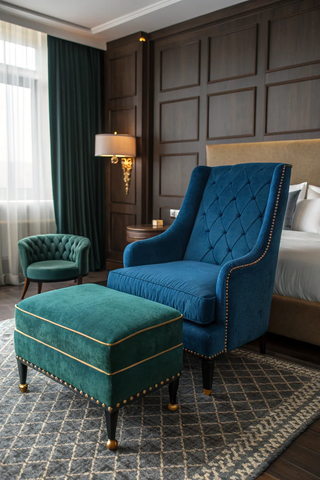 Incorporate furniture pieces in jewel tones such as a sapphire blue armchair or an emerald green ottoman. These act as bold focal points.