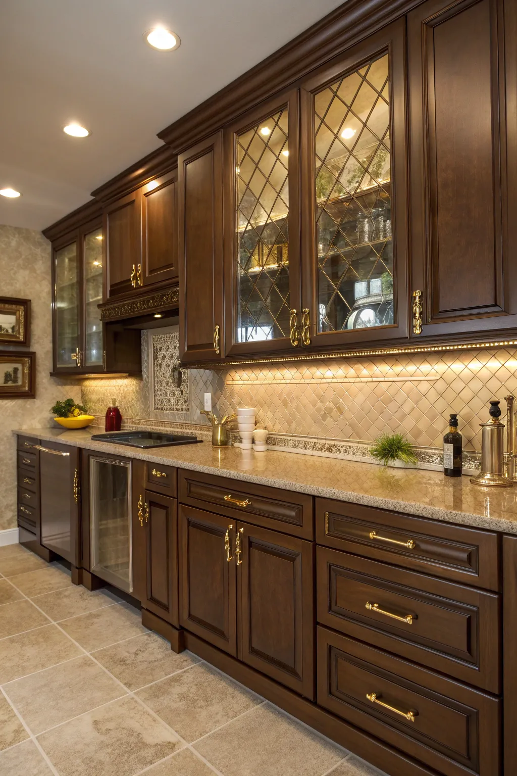 Enhance the warmth of brown cabinets by installing under-cabinet lighting. This subtle glow highlights the wood grain and makes the kitchen inviting.