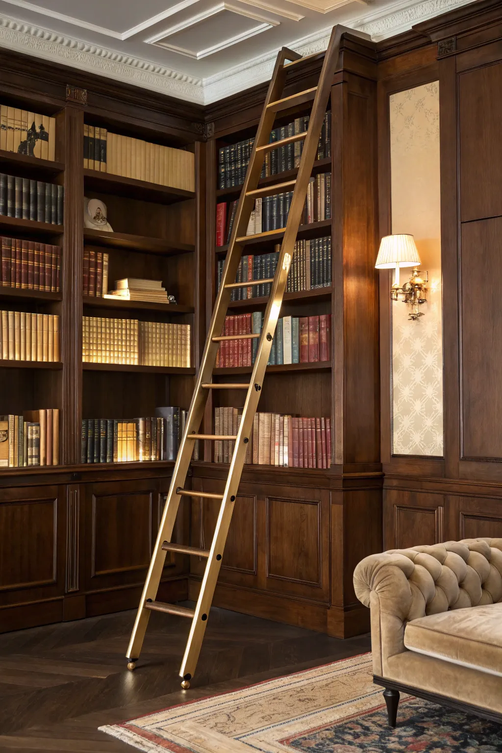 A library ladder can add a touch of drama while providing access to high shelves, perfect for organizing books or displaying art.