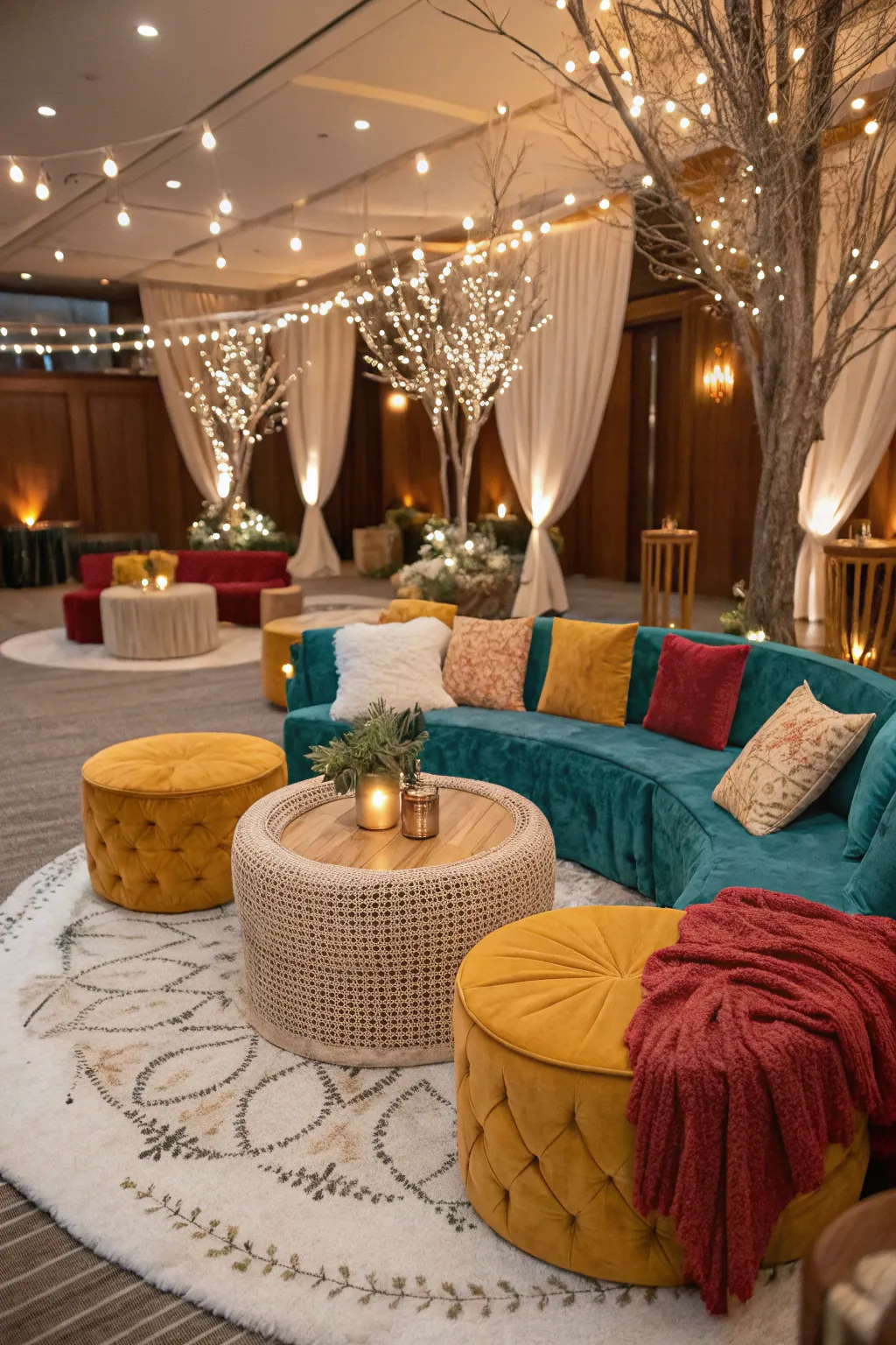 Set up cozy lounge areas with plush seating and warm throws. These spots offer guests a comfortable place to relax and enjoy the ambiance.