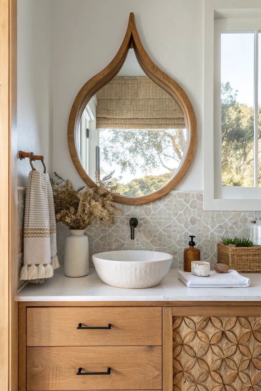- Rustic Teardrop Wooden Frame Mirror: Upgrade your bathroom with a rustic teardrop mirror that draws attention to its unique shape.
