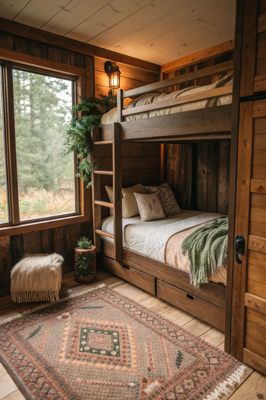 - Rustic Wood Bunk Bed: Enhance your cabin’s charm with a rustic wood bunk bed that reflects natural warmth and style.
