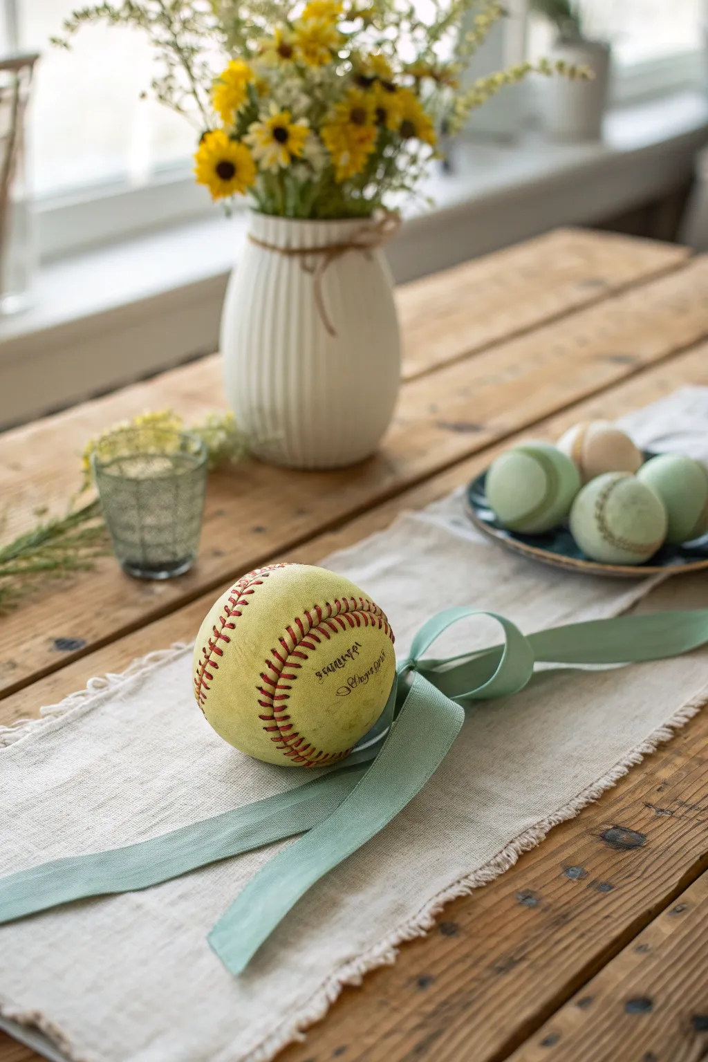 Wrap ribbons around softballs for a touch of elegance that elevates the sporty theme. It’s a simple trick that adds sophistication with ease.