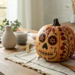 Craft fabric feathers from old scarves or fabric scraps and attach them to your pumpkin. The mix of patterns and textures adds a playful touch, reminding me of a cozy patchwork quilt.