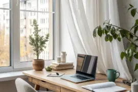 - White Linen Curtains: Enhance your office with elegant white linen curtains for a soft, serene environment.