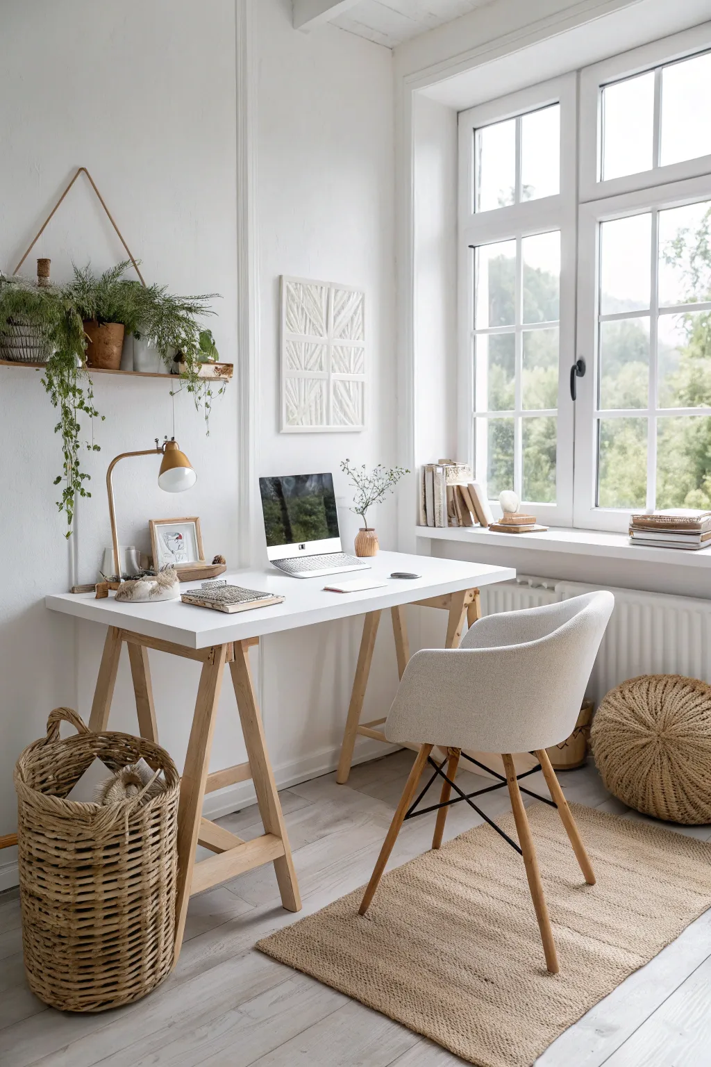 - White Desk with Natural Wood Legs: Enhance your workspace with a sleek white desk featuring natural wood legs for timeless elegance.
